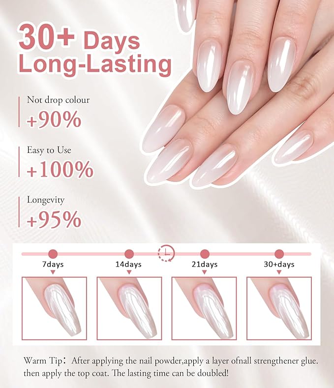 - Super Sheer Pearl Nail Powder: BISHENGYF white chrome nail powder is an ideal choose for achieving a stunning ice transparent and glossy glazed donut nail effect. This white powder has a translucent water-like sheen that gives your nails a radiant glow from within, adding dimension. If you're looking for a transparent powder, this powder definitely for you.