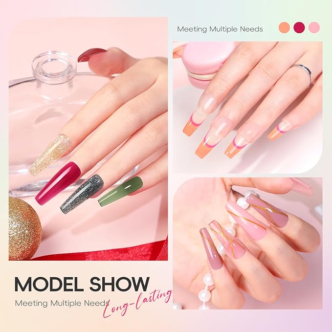 - Multiple Poly Extension Gel Kit: With 25 vibrant colors, you can design nail art suitable for any seasons or occasions. Combined with both glossy and matte top coats, this poly nail starter kit offers up to 50 stunning effects. Our gel extension kit not only extends nails but also repairs damaged nails and enhances their strength