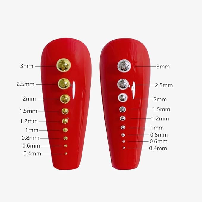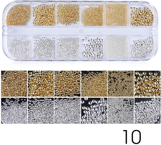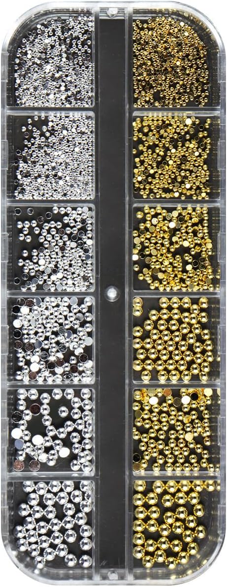 - 12Grids Mini Caviar Beads Nail Art Decorations Metal Gold/Silver Micro Ball Half Round Nail Charms little beads you get silver and gold.the beads have a flat back and the golden silver .You get a variety of sizes.Shouldn’t require much glue to apply. The nail rhinestones are gem-brilliant, pretty and sparkly, the shapes are as well as sleek and adorable.Style 3D Flatback Nail Charms:3D flatback design ensures these caviar charms stay securely in place, adding depth to your nail decor.The AB coating is bonded firmly to the outer surface of each crystal bead.